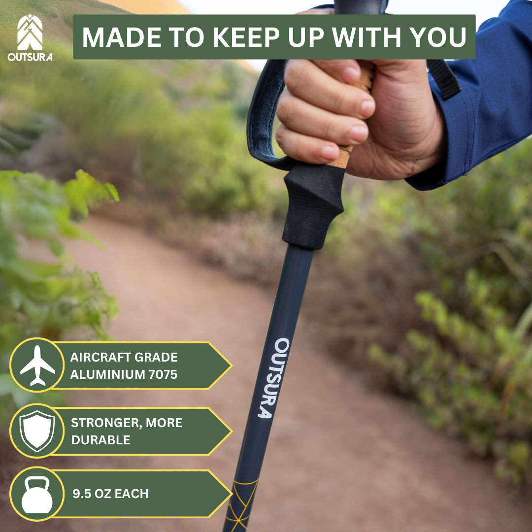 - Lightweight & Durable: Made from Aluminum 7075, known for its strength-to-weight ratio, these trekking poles are both lightweight and robust, reducing fatigue on long hikes.